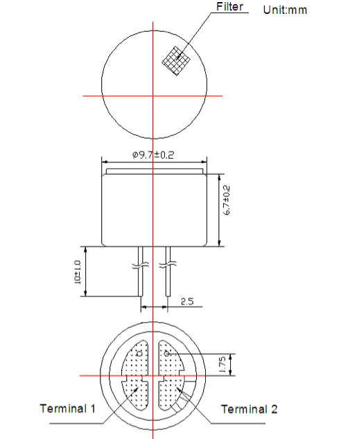 Çok yönlü elektret kondansatörlü mikrofon -40 ± 3dB, boyut 9.7 * 6.7 mm