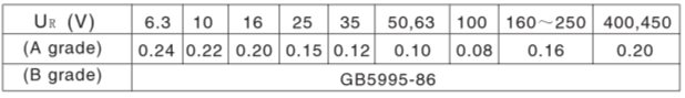 | Yayılım faktörü tg | + 20 ℃ ve 100 veya 120 Hz'de, CR> 1000μF için tg, başka bir 1000μF başına 0.02 ekleyin